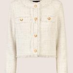 Dieser kurze Bouclé-Blazer begeistert mit eingewebten, goldfarbenen Fasern, die dem klassischen Schnitt einen Hauch von Glamour verleihen. Die offenen Fransenkanten an Ausschnitt, Vorderkante, Ärmelsaum und Saumabschluss sorgen für einen modischen Twist und unterstreichen die handwerkliche Raffinesse. Die taillierte Silhouette wird durch präzise gesetzte Teilungsnähte vorn und hinten konturiert, während eine gerade Knopfleiste mit goldfarbenen Metallknöpfen den Look luxuriös abrundet. Dekorative Zierleisten mit passenden Knöpfen setzen zusätzliche Akzente. Mit seinem runden Halsausschnitt, den langen Ärmeln und der komplett gefütterten Verarbeitung ist dieser Blazer nicht nur edel, sondern auch angenehm zu tragen. Mit einer Länge von ca. 44 cm perfekt für festliche Ensembles oder elegante Alltags-Styles.