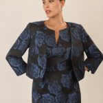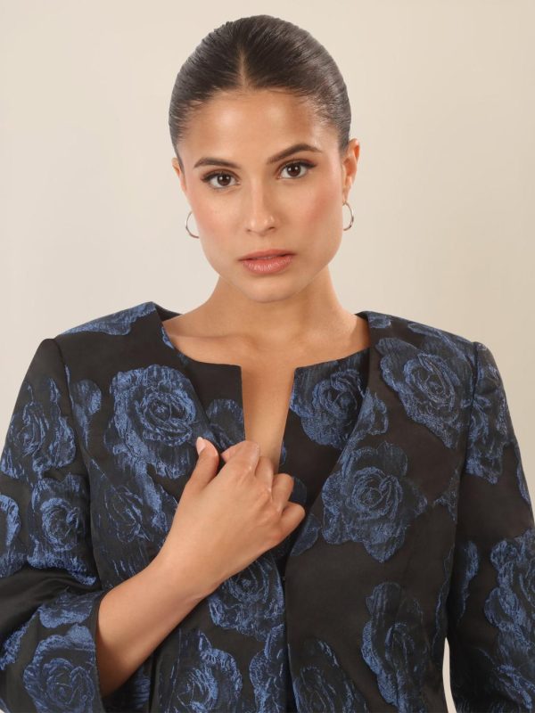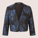 Kurzer Bolero aus strukturiertem Organza-Jacquard mit glänzenden Rosenblüten in Blau. V-Ausschnitt vorn, hinten rund. Die gerade Vorderkante ist mit einem verdeckten, bezogenen Haken am Ausschnitt schließbar. Formgebende Teilungsnähte verleihen eine präzise Passform. 3/4 lange Ärmel mit kleinem Schlitz am Saum sorgen für einen eleganten Abschluss. Der Bolero ist vollständig gefüttert und etwa 40 cm lang – ideal als stilvolle Ergänzung für festliche Outfits.
