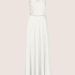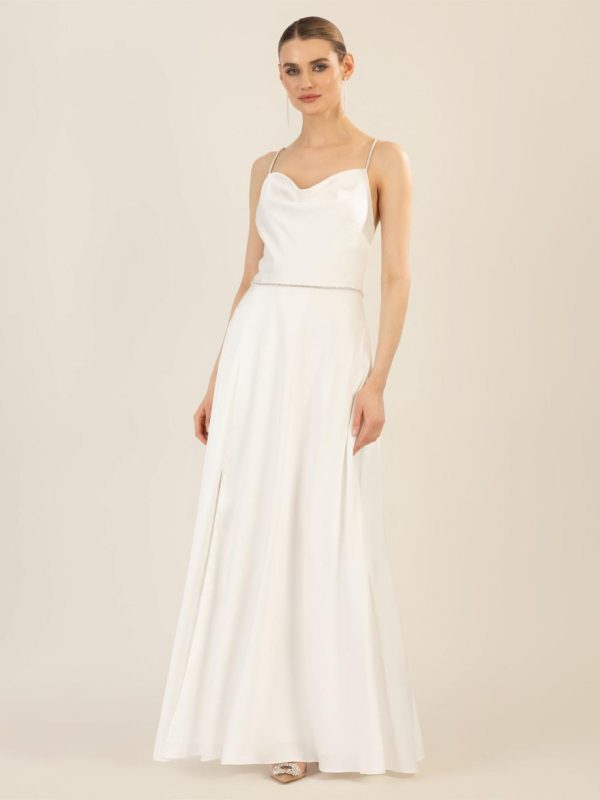 Edles Abendkleid mit filigranen Spaghettiträgern und eleganter Rückenpartie. Der figurbetonte Schnitt betont die Taille, während der fließende Rock für eine feminine und schwungvolle Silhouette sorgt. Das schlichte Oberteil harmoniert perfekt mit den zarten Trägerdetails und bietet eine zeitlose Optik.