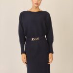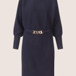 Dieses feminine Strickkleid vereint luxuriösen Tragekomfort mit modischer Raffinesse. Die weiche Viskose-Kaschmir-Mischung sorgt für ein angenehmes Hautgefühl, während das quer gestrickte Oberteil mit Fledermausärmeln und schmalen Bündchen eine lässig-elegante Silhouette zaubert. Der runde Ausschnitt vorne und hinten verleiht dem Look eine klassische Note. Ein breiter Taillenbund mit integriertem Ziergürtel und goldfarbenen Kettendetails akzentuiert die Körpermitte auf stilvolle Weise. Die schmale Rockform unterstreicht die feminine Linie. Länge: ca. 102 cm.