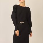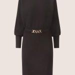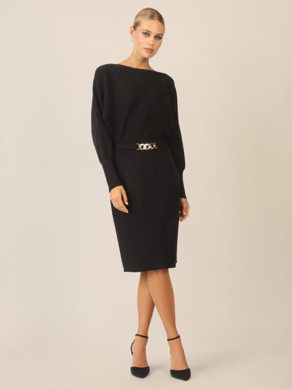 Dieses feminine Strickkleid vereint luxuriösen Tragekomfort mit modischer Raffinesse. Die weiche Viskose-Kaschmir-Mischung sorgt für ein angenehmes Hautgefühl, während das quer gestrickte Oberteil mit Fledermausärmeln und schmalen Bündchen eine lässig-elegante Silhouette zaubert. Der runde Ausschnitt vorne und hinten verleiht dem Look eine klassische Note. Ein breiter Taillenbund mit integriertem Ziergürtel und goldfarbenen Kettendetails akzentuiert die Körpermitte auf stilvolle Weise. Die schmale Rockform unterstreicht die feminine Linie. Länge: ca. 102 cm.