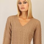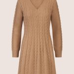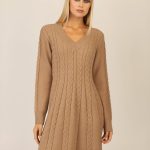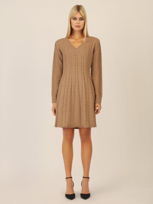 APART Fashion KLEIDER | DAMEN Strickkleid Mit Zopfmuster Und V-Ausschnitt Camel