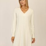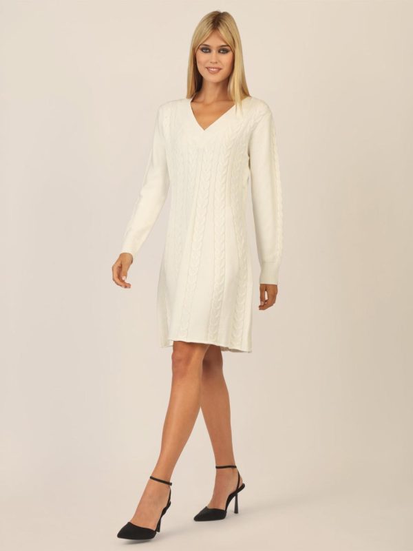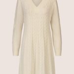 Dieses kurze Strickkleid begeistert mit seinem charmanten Zopfmuster und einer hochwertigen Viskose-Kaschmir-Mischung, die wunderbar weich auf der Haut liegt. Der tiefe V-Ausschnitt mit breiter Rippenblende sorgt für einen modernen Look, während die langen Ärmel mit breitem Bündchen Gemütlichkeit versprechen. Die leicht taillierte Silhouette und der ausgestellte Rockpart verleihen dem Kleid eine verspielte, feminine Bewegung – perfekt für stilvolle Auftritte im Alltag oder zu besonderen Anlässen. Länge: ca. 94 cm.