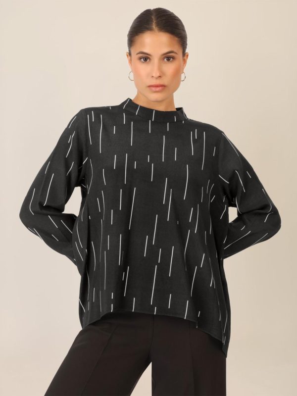 Diese legere Bluse mit angesagtem Allover-Print bringt Farbe und Leichtigkeit in deinen Look. Der runde Ausschnitt mit kleinem Stehkragen und rückseitigem Schlitz samt verdecktem Knopf verleiht ihr einen dezenten Retro-Charme. Überschnittene Schultern und der leicht ausgestellte Schnitt sorgen für eine entspannte Passform, während der hinten verlängerte Saum modernen Style beweist. Die langen, geraden Ärmel mit weitem Abschluss runden den Look lässig ab. Rückenlänge: ca. 80 cm.