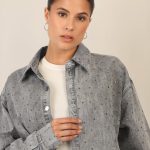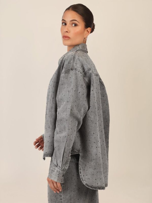 Dieses stark oversized geschnittene Jeanshemd ist ein echtes Highlight-Piece. Der leichte Used-Effekt trifft auf ein Allover-Design aus schwarzen Kristallsteinen, das dem klassischen Look einen edlen Twist verleiht. Überschnittene Schultern und extra weite Ärmel mit Manschetten unterstreichen die lässige, moderne Silhouette. Eine durchgehende Druckknopfleiste sowie silberfarbene Druckknöpfe an den Manschetten setzen authentische Denim-Akzente. Das Rückenteil ist mit einer typischen Passe gearbeitet. Jeans-typische Nähte runden das Design ab. Der Saum ist vorne und hinten abgerundet, hinten länger geschnitten. Länge: hinten ca. 74cm, vorne ca. 64cm.