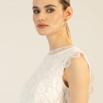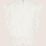 Feminines Spitzentop mit zarten Häkel-Details und ärmellosem Design. Der hochgeschlossene Rundhalsausschnitt und die feinen Spitzenborten verleihen dem Top eine romantische Optik, während der leicht taillierte Schnitt die Silhouette betont. Ein vielseitiges Highlight für besondere Anlässe.