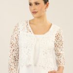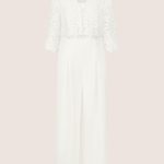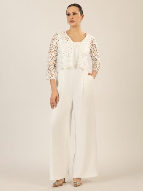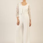 Dieser edle Hochzeitsoverall vereint moderne Eleganz mit klassischem Charme und ist die ideale Wahl für stilbewusste Bräute. Das Oberteil besteht aus feiner, floraler Spitze, die durch ein passendes Spitzenjäckchen mit Dreiviertelärmeln ergänzt wird. Die zarten Spitzenabschlüsse verleihen dem Look eine romantische Note, während der V-Ausschnitt für einen modernen Akzent sorgt.