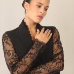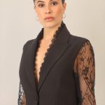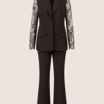 Ein Hosenanzug, der klassische Tailoring-Kunst mit romantischen Details vereint. Der figurbetont geschnittene Blazer besticht durch ein tiefes, aufsteigendes Revers und eine abknöpfbare Spitzenborte entlang der Ausschnittkante – ein edles Highlight mit Wandelbarkeit. Raffinierte Teilungsnähte formen das Oberteil präzise und unterstreichen die feminine Linie. Schräge Klappentaschen auf Hüfthöhe setzen praktische Akzente, während ein rückwärtiger Schlitz für Bewegungsfreiheit sorgt. Die langen Ärmel aus transparenter, weicher Spitze enden in einer zarten Bogenkante – ein stilvoller Kontrast zum strukturierten Bodypart, der vollständig gefüttert ist. Die passende Hose überzeugt mit einer eleganten Bootcut-Silhouette und fein abgestimmten Details: Ein geformter Bund mit Spitzenapplikation trifft auf klassische Gürtelschlaufen und einen verdeckten Hakenverschluss. Schräge Eingriffstaschen runden das Design alltagstauglich ab. Dieser Zweiteiler ist ein moderner Klassiker – raffiniert, feminin und mit viel Liebe zum Detail. Blazerlänge ca. 68?cm, Seitenlänge der Hose ca. 108?cm.