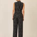 Dieser ärmellose Overall überzeugt mit legerer Eleganz und einem modischen Allover-Print auf einer leicht strukturierten, gebondeten Ware. Der runde Ausschnitt geht in einen schmalen Stehkragen über und verleiht dem Look eine cleane, zeitgemäße Note. Das Oberteil ist durch formgebende Abnäher leicht tailliert und sorgt für eine schöne Silhouette. Ein breiter Tailleneinsatz mit seitlichen Gürtelschlaufen betont die Mitte und bietet Platz für den separat mitgelieferten Bindegürtel. Die Hosenpartie fällt locker mit weitem Beinverlauf und sorgt für angenehme Bewegungsfreiheit. Seitliche Eingriffstaschen bringen praktischen Komfort. Ein Reißverschluss in der hinteren Mitte rundet das Design funktional ab. Der ideale Look für stilvolle Tages- oder Abendanlässe mit modischem Anspruch.