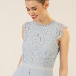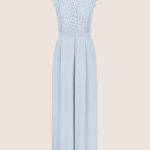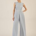 Dieser elegante Overall kombiniert das Spitzenoberteil mit einer stilvollen, fließenden Hose. Das Oberteil besticht durch feine, florale Spitze und leicht angeschnittene Flügelärmel, die für einen zarten Look sorgen. Ein schlichter Rundhalsausschnitt rundet das Oberteil harmonisch ab. Die lange, gerade geschnittene Hose mit fließendem Stoff verleiht dem Gesamtlook eine zeitlose Silhouette und hohen Tragekomfort.